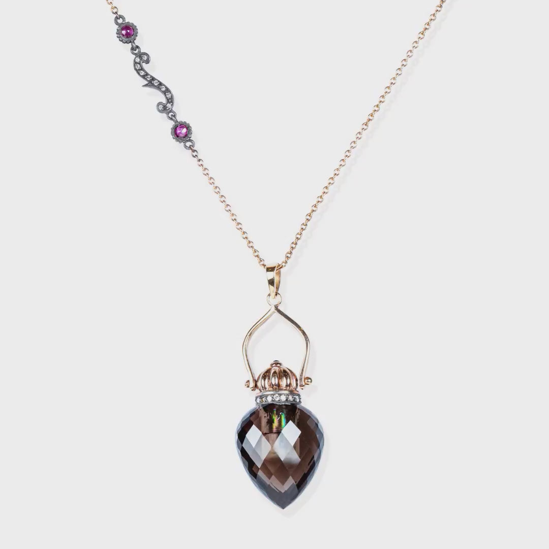 ارتقِ بأناقتك مع قلادتنا الذهبية المرصعة بالتوباز الدخاني والألماس، المصممة بأسلوب عتيق. تتميز هذه القلادة بتفاصيلها الدقيقة، مما يجعلها إضافةً خالدة لمجموعة مجوهراتك.